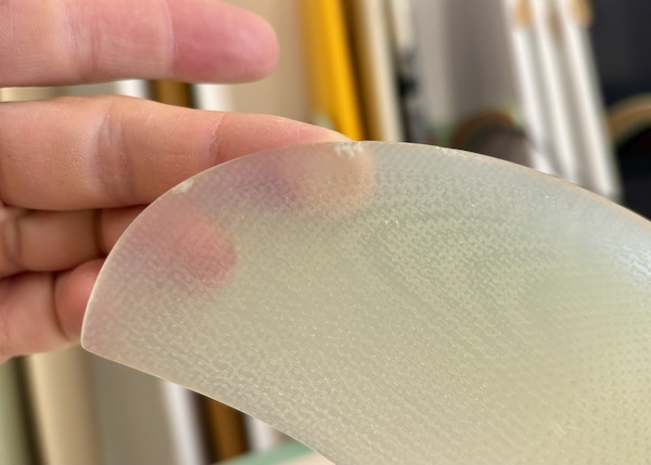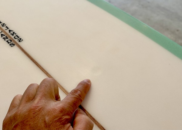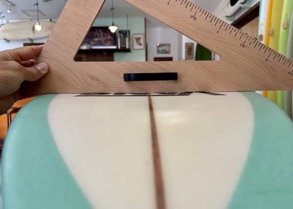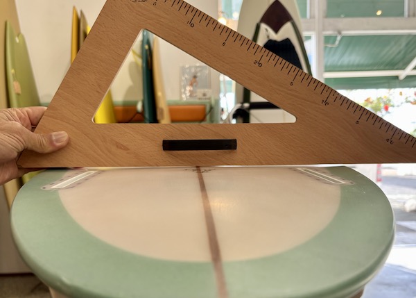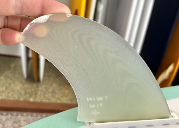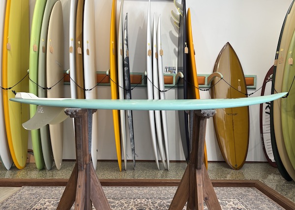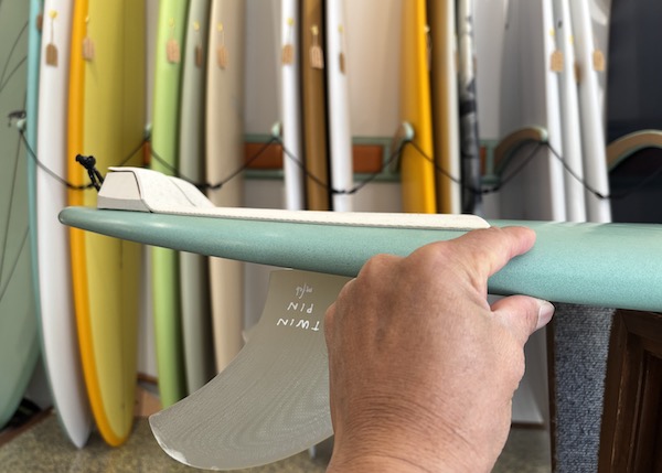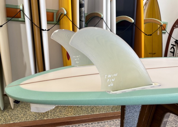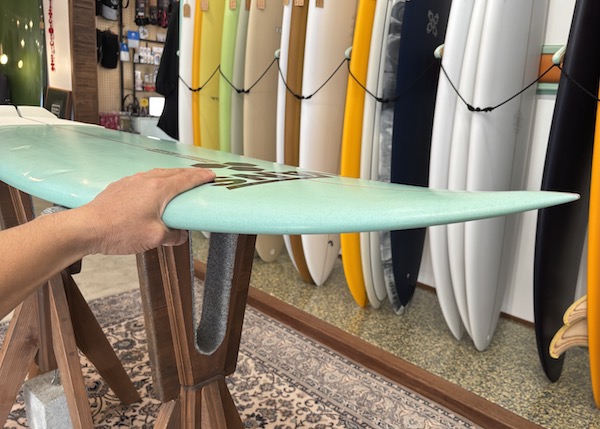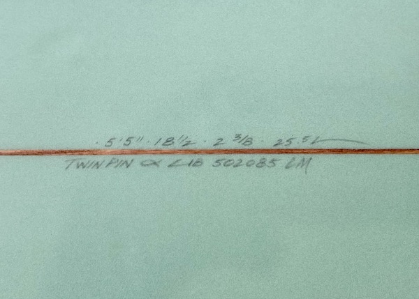 From the nose and toward the back, the bottom is flat, then to a slight roll, and vee in the back half, which creates a buttery board that is both responsive and solid. The rails are low, so most people ride the Twin Pin at least 1/8” thicker than their shortboard. It works best with the special twin fin template Britt designed just for this board that is between a keel and upright and provides the right balance of drive, hold, and maneuverability.