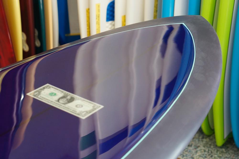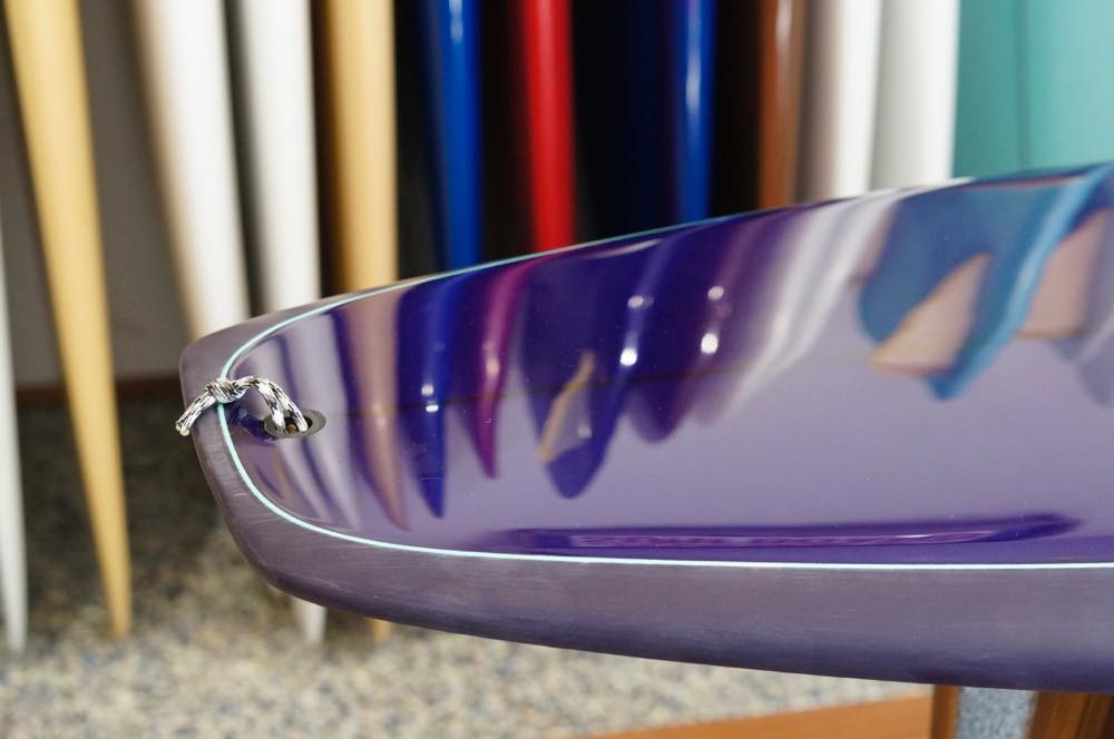 Polished violet tint deck, satin finish violet rails & bottom,light blue resin pinline, &1 Bill mark,leash cup, Future quad plug.