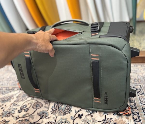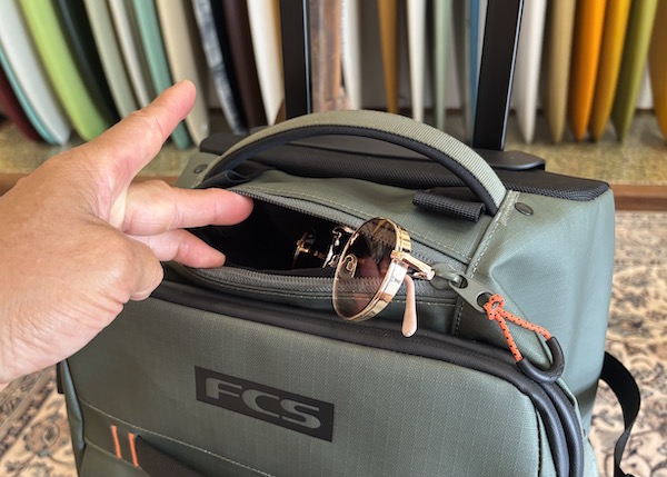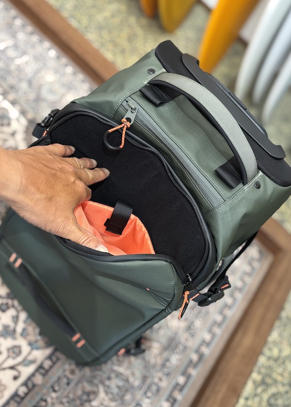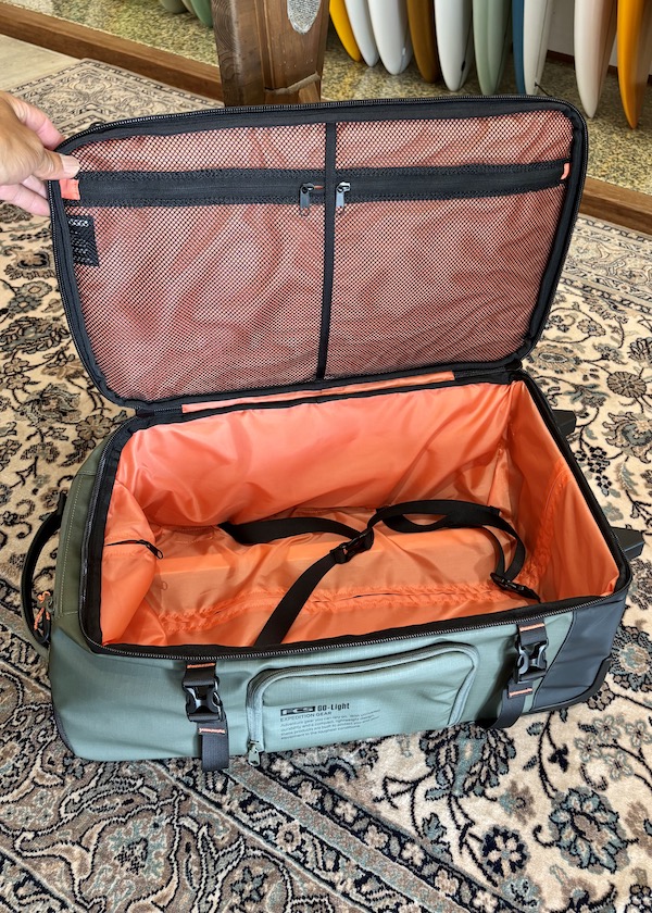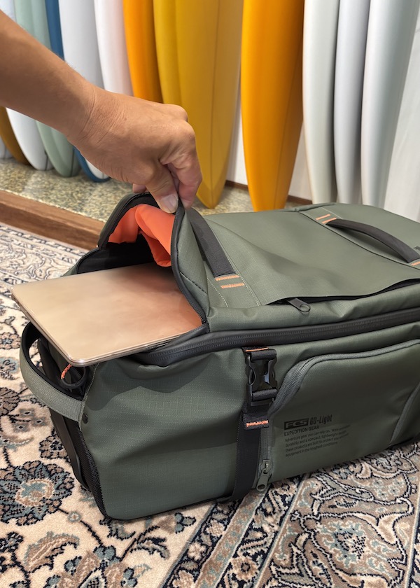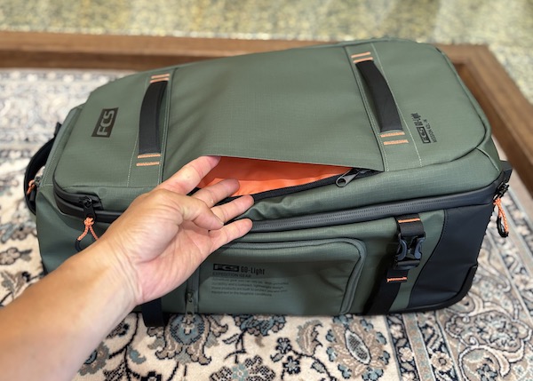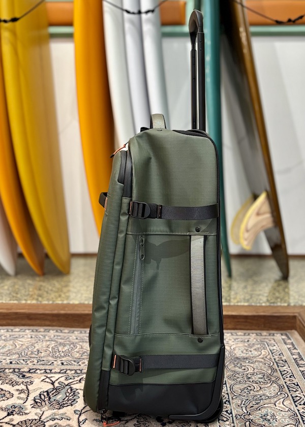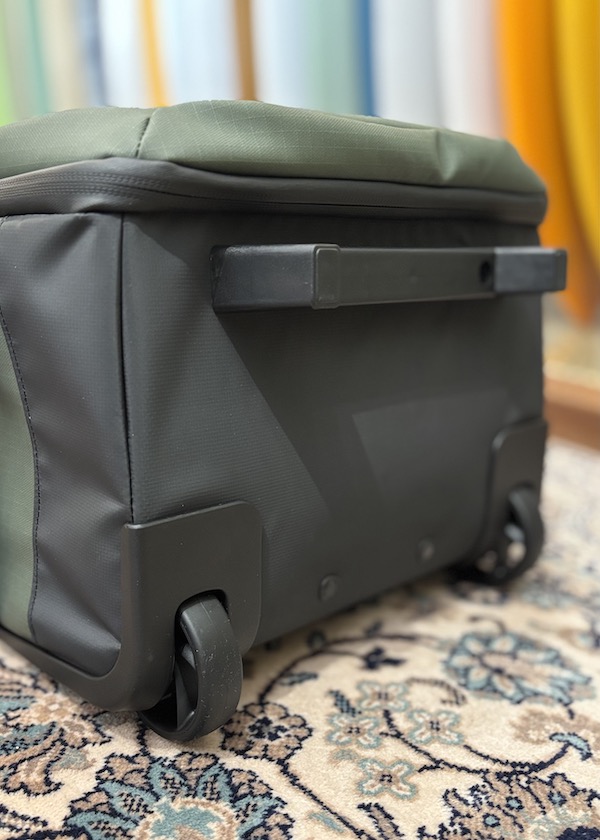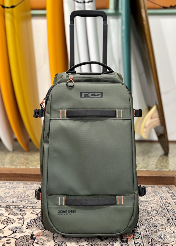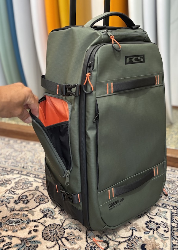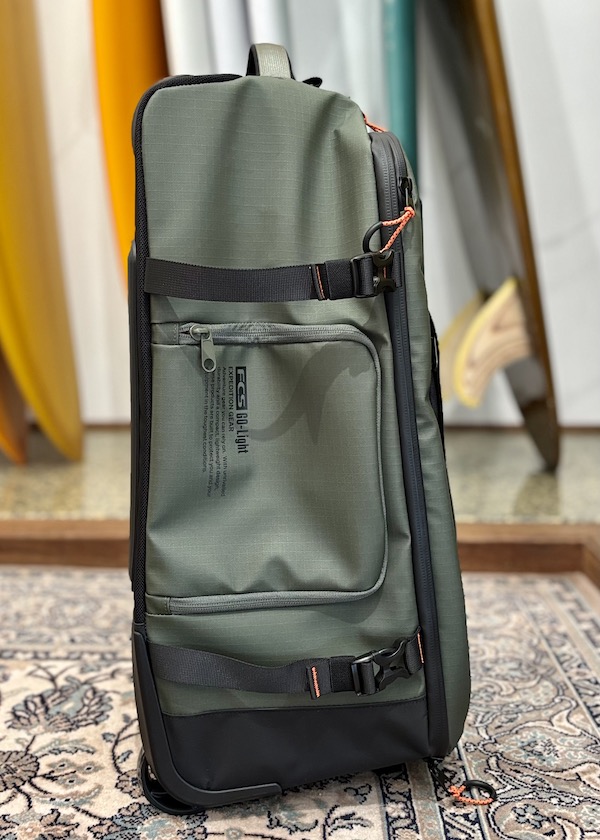 FCS GO-Lightトラベルウィーリーボードカバー(別売り)を装着すれば、バッグとボードを一体化したユニットとしてトロリー移動が可能です。