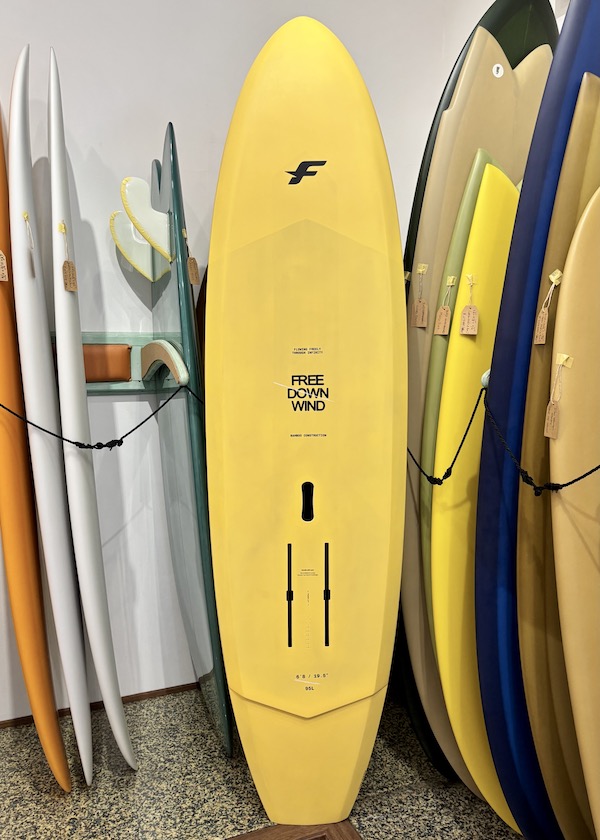 FREE SURFと比較して、FREE DOWNWINDはより安定したボードで、厚みが増し、ノーズとボトムの設置面積が広くなり、四角いレールが特徴です。
