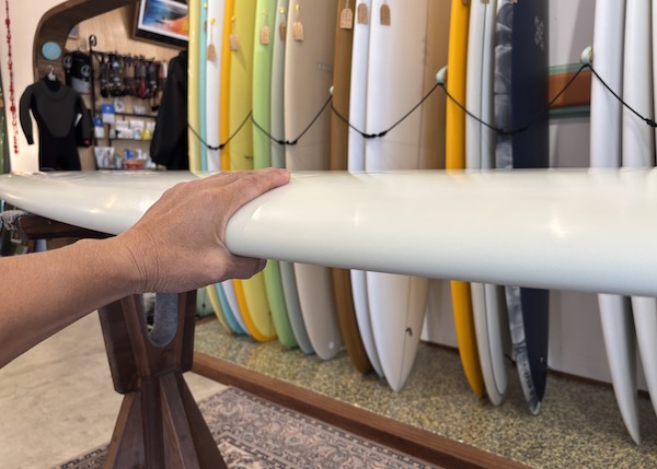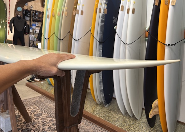 パワーのある掘れた波に対応するためにレールは薄くシェイプされていますが、寛容性とパドリングの容易さのためにセンター厚はボリュームを残しています。