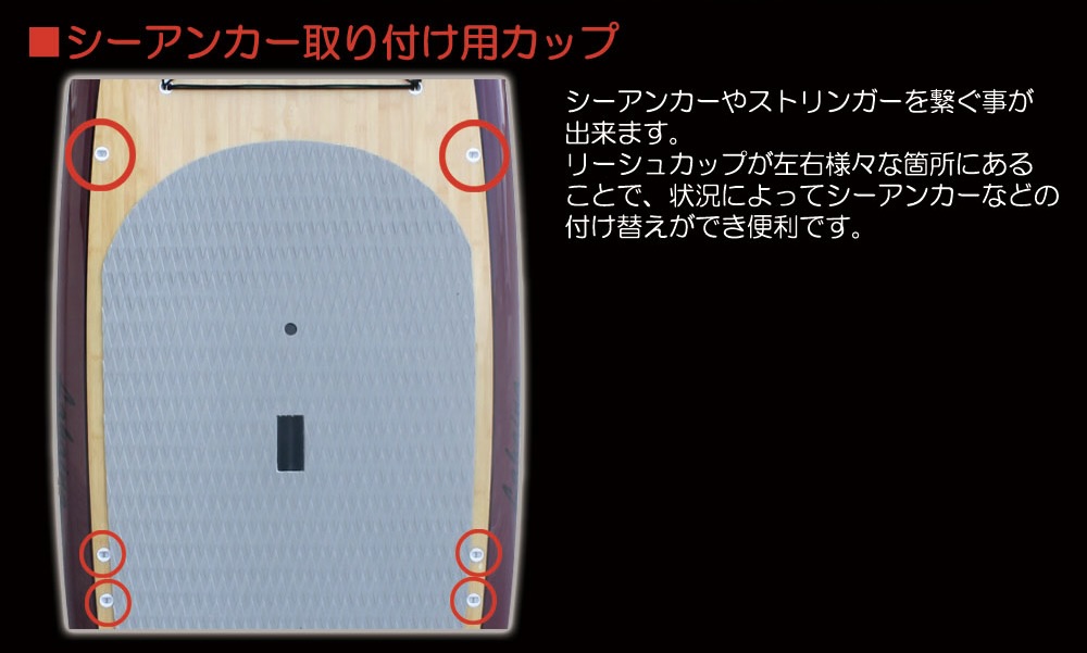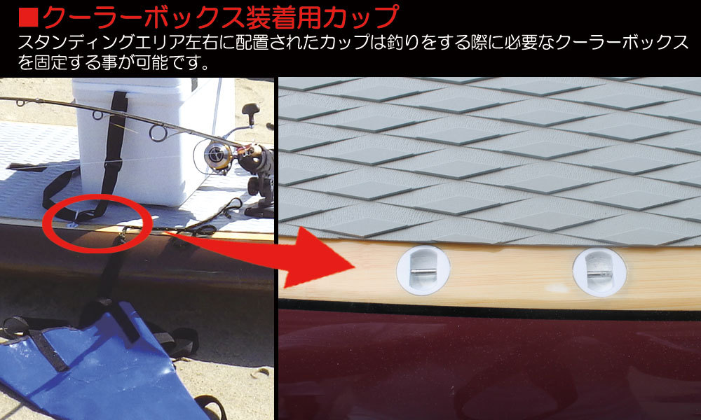 お手持ちのコード等を使い、シーアンカーを取り付けたり、荷物やクーラーボックスを固定できるので、長距離のクルージングやFISINGにとっても使いやすい設計です。