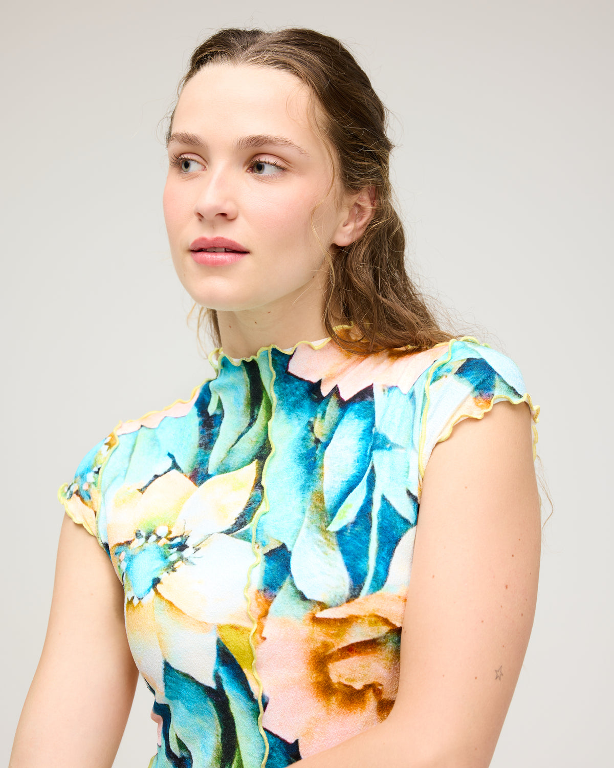 アウトステッチのリップルフリルがキュートなノースリーブラッシュガード。