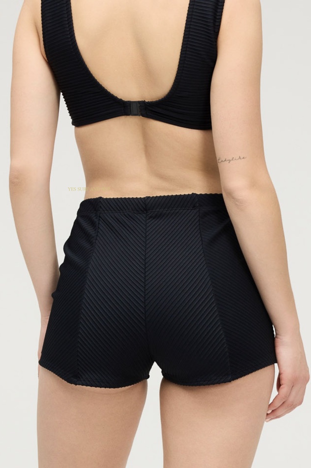 ボードショーツ型ビキニパンツと胸元までしっかりとサポートしてくれるビキニトップのセットアップ。